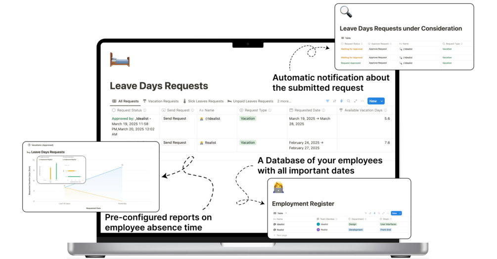 To address this challenge, I created this Leave Days Template. My goal in developing Notion environments and ready-made templates is to help businesses meet all their operational needs in a single platform.
